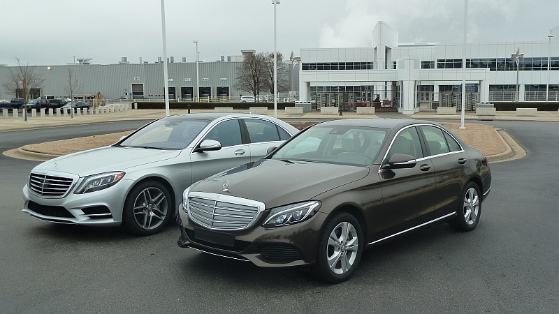 In der Halle für Feinarbeiten erwartet sie uns schließlich, die neue C-Klasse, als Diesel 220 BlueTEC mit 170 PS und 400 NM, von 0 auf 100 km/h in 8.1 Sekunden. Nicht in Tuscaloosa gebaut, die Produktion dort beginnt erst noch, sondern vom Bremener Werk extra für uns eingeschifft. Reine Handarbeit. In Citrinbraun Metallic. Die Farbe wirkt unter dem krassen Neonlicht erst mal etwas gewöhnungsbedürftig. Das war es dann aber auch schon mit Fremdeln – denn grundsätzlich wirkt das Auto „somehow familiar“…- ja. Alle sehen es, und alle sprechen es aus. „The new C-Class looks like a shrinked version of the S-Class“, „Hey, look, there’s the S-Class’s twin“ und so fort. Wer C sagt, muss auch S sagen, die Ähnlichkeit ist unverhohlen da. Doch ist die C-Klasse damit nur ein billiger Abklatsch? Auf keinen Fall. Ich finde, die neue C-Klasse ist noch immer ein eigenständiges Auto im oberen Mittelklasse-Segment, dass einfach nur geschickt in die Trickkiste gegriffen hat, um sein Potenzial nach oben hin zu verbessern.
