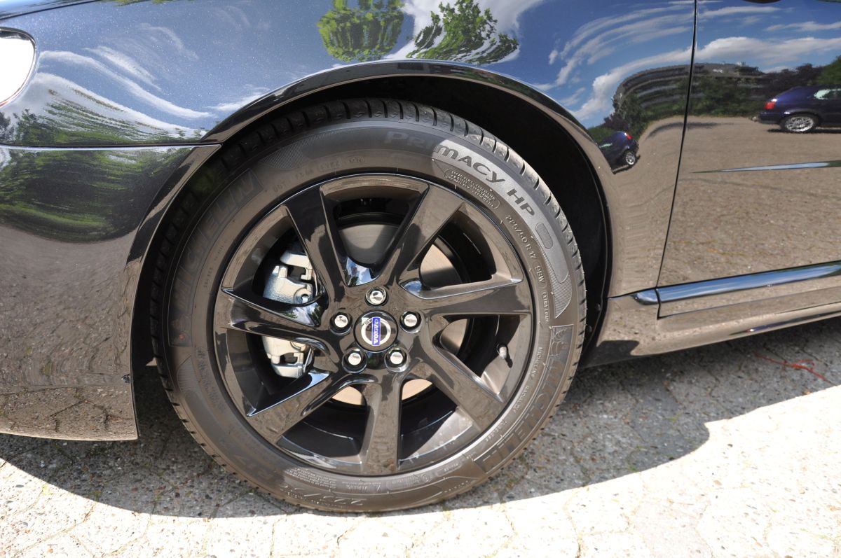 Angenehm kantig und bis auf die Nummernschilder und Leuchteinheiten schwarz wie die Nacht ist der Volvo einfach einzigartig. Viele Details in hochglänzendem schwarz heben den V70 in der Black Edition von den gewöhnlicheren Vertretern der Baureihe ab, darunter die Lamellen im Kühlergrill, die Außenspiegelkappen, die Rahmen der Seitenfenster, die Heckklappenleiste sowie die Dachreling. Die schwarzen 17-Zöller (18-Zöller optional erhältlich) und ein neues Fahrwerk, das den V70 etwas näher gen Boden drückt, sorgen für einen Hauch mehr Sportlichkeit. Die Bereifung, Michelin „Primacy HP“ in 225/50 R17 allerdings ist auf Komfort ausgelegt und fährt sich entsprechend kommod.